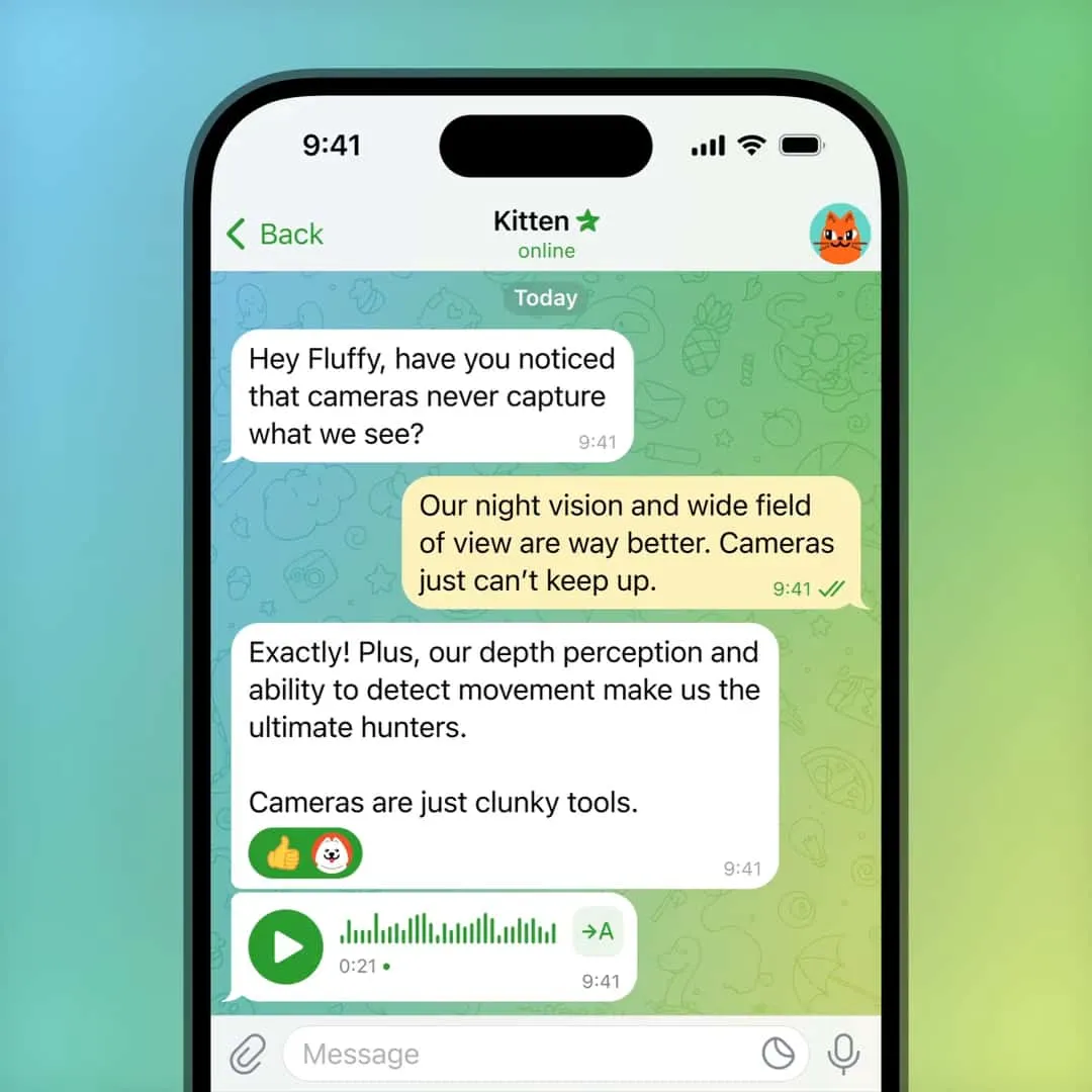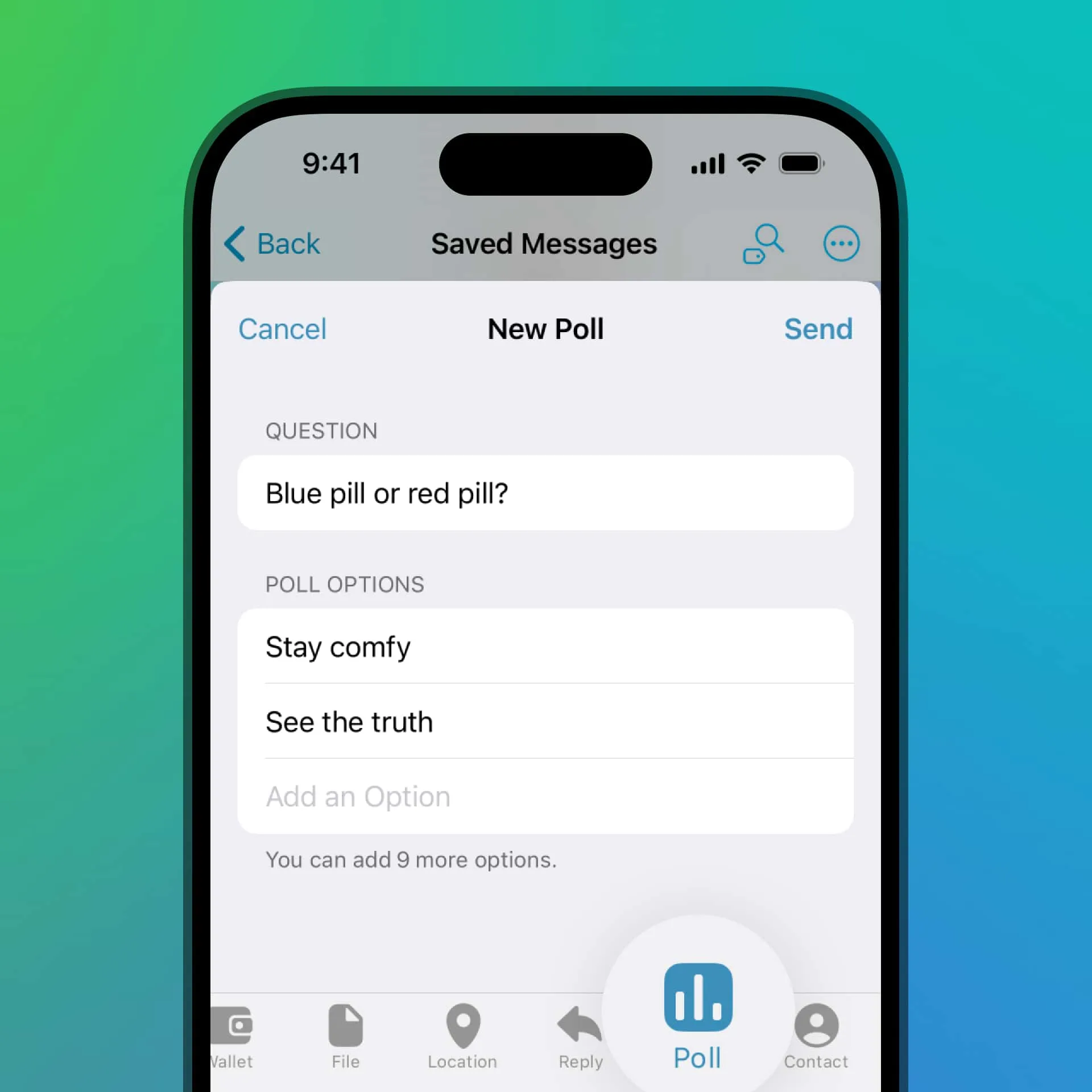 此次更新使投票功能更加灵活,最多支持12 个选项。现在还可以将投票发送到您的已保存消息中——以便将结果保存下来供日后参考,或稍后与其他聊天分享投票。