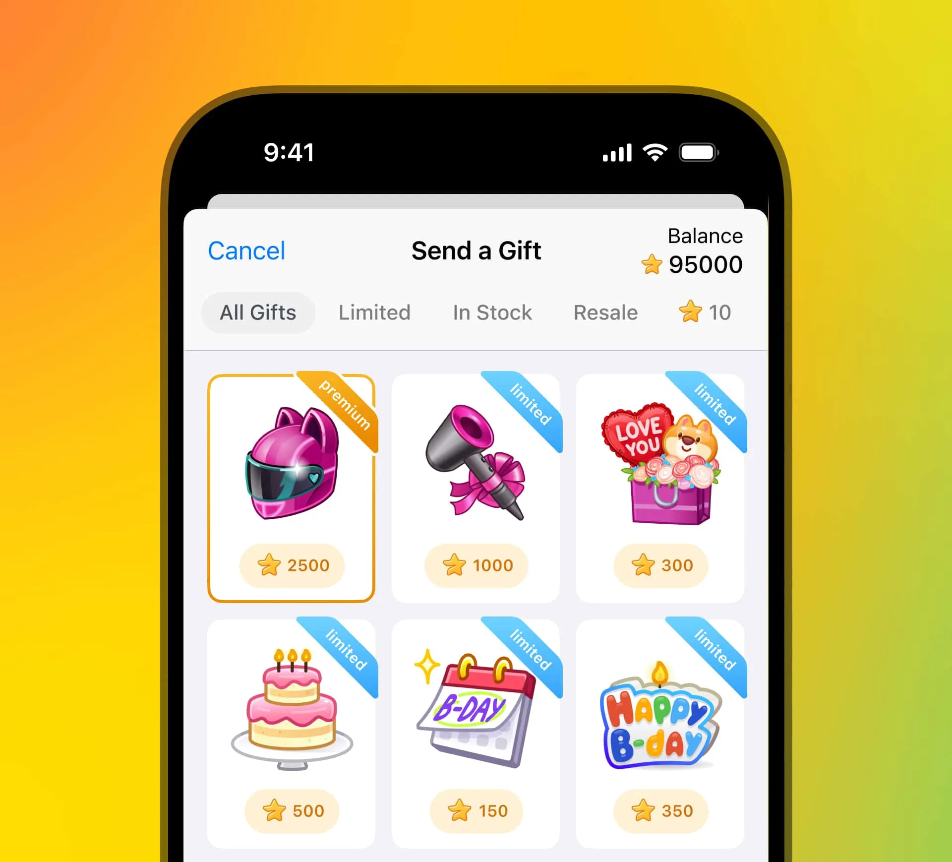 Telegram 礼物非常受欢迎,新品发布往往几分钟内就会售罄。虽然您始终可以在 礼物市场从其他用户那里购买礼物,但我们希望更多用户能够在新品发布时第一时间获得礼物。